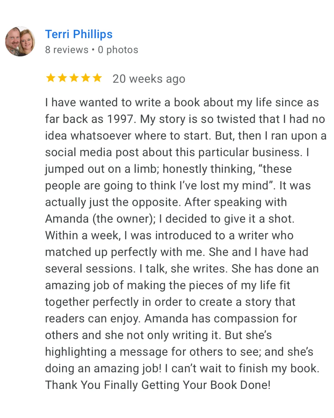 When I first met my writer Rosalie at Finally Get Your Book Done, I didn’t know what to expect. I’m a married mom with children and thought it would be nice for my family to one day know my life story. Of course I’ve shared bits and pieces of my life through casual car rides and conversations… but as I’m aging I wanted my life more documented so that it would not be forgotten. I was interested in having my story actually and factually written out.