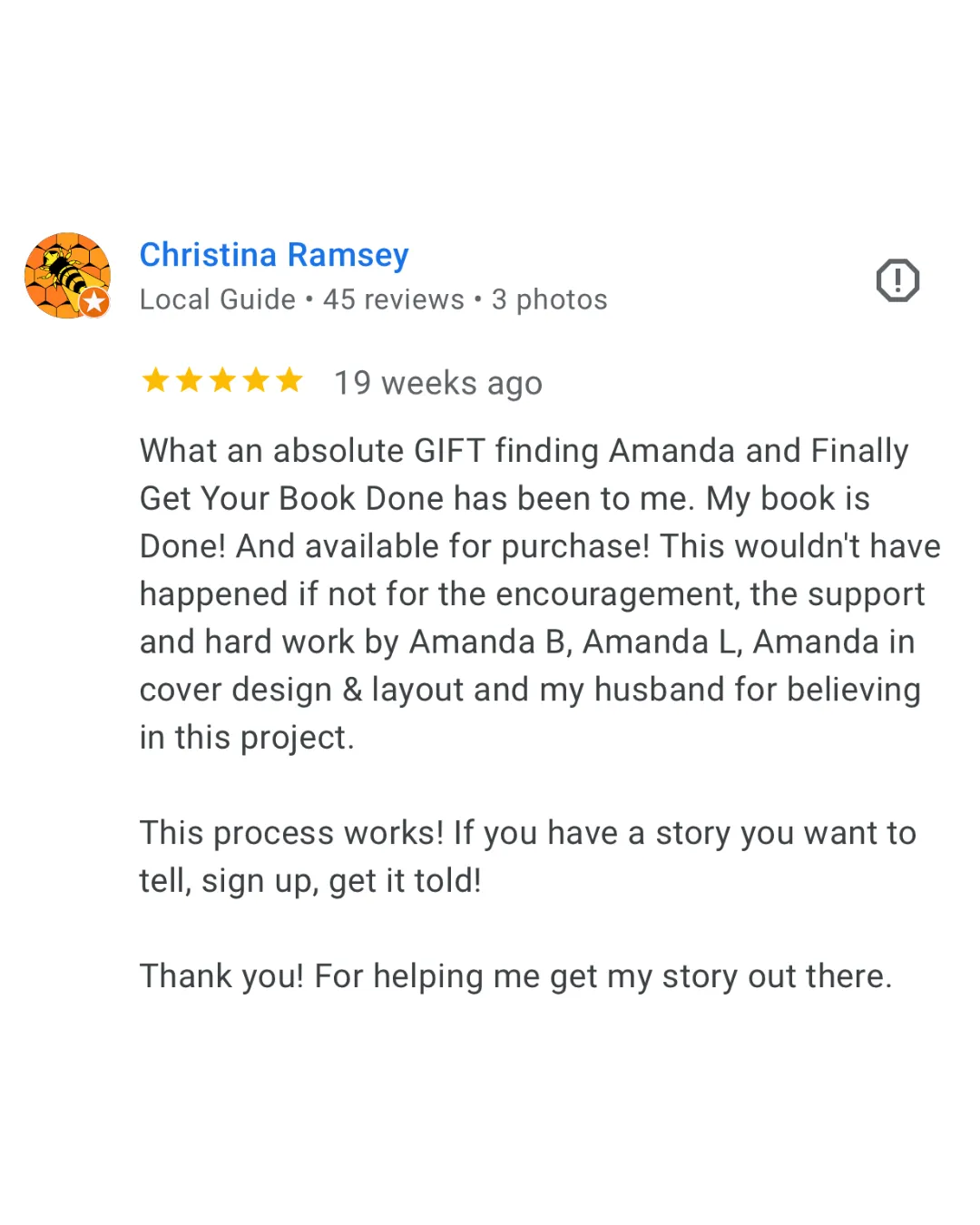 I’ve tried keeping journals and diary entries to no avail and I always get stuck because it never lands on the page the way I’m thinking about it. But this is different… Rosalie captures what I want to say without me struggling to do any of the writing myself. In fact I’m finding it both invigorating and healing to tell someone my story. I’m getting much more value than I ever expected and would recommend Finally Get Your Book Done to anyone who has even the smallest thought about a story or an experience they want to tell.